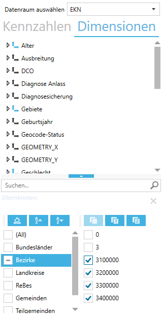 In der Dimensionsauswahl können die Hierarchien der Dimensionen durchsucht und einzelne Hierarchieebenen oder -knoten in die Analyse eingefügt werden.